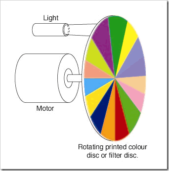 If we use a filter disc and shine a White light through it, we have a similar situation. Most filters allow some white light through them. In general therefore we will see White light for 100% of each revolution of the wheel. The points in the previous paragraphs also then apply.